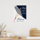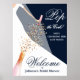 Denna välkomstskylt för bröllopsfesten har en flaska med gnistrande vin som sprutar guldglittrande falska paljetter och en brud i klänning och slöja som håller en champagneflaska mot en marinblå bakgrund och era detaljer i chic bokstavsstil. Beställ tryckt eller som en DIREKT NEDLADDNING för att få den tryckt lokalt. MATCHANDE artiklar i vår kollektion.