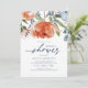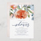 Inbjudningskort för möhippa med Orange; persiko- och Blue-Blommigtar (Registry & Bröllop Website on Back): Dessa unika inbjudningskort för möhippa-funktioner har orange, persikor- och kräftblått botaniskt löv och blommor längst upp. Baksidan har en matchande krans, vattenfärgsbakgrund, parets registerinfo och bröllop webbplats. Ändra texten så att den blir din egen. Du kan också ändra texten färg och färg i bakgrunden!