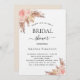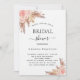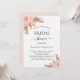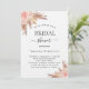 För en modern boho stil möhippa. En vit bakgrund på framsidan. Dekoreras med ro guld och rosa blommigt, rosor och pampasgräs. Anpassa och lägg till information om namn och party. Bakåt: ro guld.
