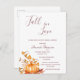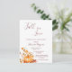 På framsidan: Ett modernt, elegant och enkelt Inbjudningskort för möhippan för fall. En vit bakgrund. Dekorerad med en guldpumpa, blad och vita blommor. Mallar för bruden att vara namn, datum och ställe i duschen. Texten: Möhippan är skriven med ett stort handskript i stil, mörk ro guld färgad brev. Tillbaka: en pumpa. Tips! Om du inte vill att det ska se ut som ett vykort klickar du på anpassa, går till baksidan och tar bort delaren och lägger till frimärke.