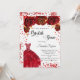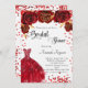 Modern, snyggt och glamorös inbjudan till Möhippa. En vit bakgrund med gnistor, en röd klänning och röd ros, blommor. Namn är skrivet med ett modernt handskript i stil. Anpassa och lägg till information om party.