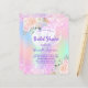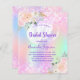 En regnbåge, holografisk färgad med bakgrund i lila, rosa, mynta grönt. Dekorerad med rosa faux-gnistor och vita ballonger. Anpassa och lägg till information om namn och party. Namn är skrivet med ett handskript i stil, lila färgad brev.