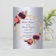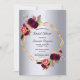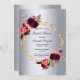 Framtill: En faux silver metallisk tittar bakgrund med ett faux guld geometric ram. Dekorerad med mörk burgundy och rosa blommor, ro och boho stil fjädrar. Mallar för uppgifter om bruden och party namn. Namn är skrivet med ett handskript stil, svart färgad brev. Baksida: Faux silver metallisk tittar bakgrund.