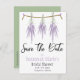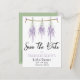Skicka meddelandet "Spara datum" för en möhippa som innehåller tre lavendelpaket som torkar från en sträng. Anpassa fram- och baktexterna i mallen fält eller använda i redigeringsdesignen verktyg om du vill välja det teckensnitt som du vill använda stil, storlek och färg.