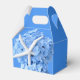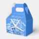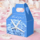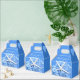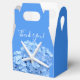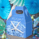 Blått bröllop-möhippa eller mottagningsfavör med handtag. Hydrangea-blomman och stjärnfiskdesign på söt-blått med vit text att säga "tack" till gästerna vid bröllop eller möhippa. Den havsmatade bilden dekorerar fram och bak och innehåller en verklig ljusblå vattenblomma med en vit havsstjärna som fastnar i petalerna. Text är handskrivet skript i vitt. Lådan måste vikas efter köpet. Läs mer om produkten nedan.
