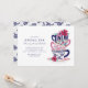 En vit och feminin inbjudningskort för möhippan-design med en stapel av rosa, guld och blåte kopp och blommor.