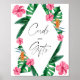 Tropical Handflatan Watercolor Inbjudningskort för möhippan. Konstruktionen har en vattenfärgad elegant buquet av klassisk strandvattenfärg, grönenergi och blommor, inklusive rosa hibiscus, orange och blåa fåglar av paradiset, grönt grey och mörk grönt handflatan löv.