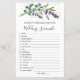 Denna utformning har en vattenfärgad illustration av lila lavender-blommor och eukalyptus-blad. På överdelen av kortet - konfetti med grön effekt. Grey Möhippa Games - Dubbla sided card - Två spel i ett! Möhippa What's in your Purse Game in the front of card and Bröllop Scramble match on the reverse. Svaret på nyckel för Bröllop Scramble-spelet: Bride, Groom, Bröllop Cake, Honeymoon, Äkta kärlek, White Dress, Snöre, Happiness, Unity Candle, Bridesmaid, Marskalkar, tjänsteman, Chapel, Giftermål Vows, Ring Bearer.