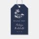 SISTA SKÅLEN VID KUSTEN | Möhippa tack favor tag. Illustration av kustscen på marinblå bakgrund och randigt mönster på baksidan.