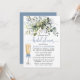 Modern Elegant Watercolor Botanical Grey Inbjudningskort för möhippan Card omfattar eukalyptus löv, grönt botaniskt löv, dammiga blå löv och andra vackra botaniska grejer. Dusty Blue Back. Champagne Glass med Dusty Blue Bow. Trendig Calligraphy Script.