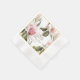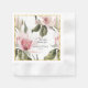 En vacker möhippa-napkin som matchar den pappra plattan, i en rosa vattenfärgsfärgad blommigt med en guld-kvadrat runt kant utanför.
