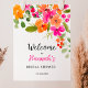 Ett välkomsttecken för en orange för chic, rosa och grönt blommigt i vattenfärg med söt handmålade blommor i och blommar med grönt löv. En söt möhippa party.