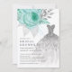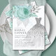 Vacker aqua & silver blommigt inbjudningskort för möhippan med en glamorös bröllop klänning. Vänd över möhippan inbjudan om du vill visa en samordnande blommigt tillbaka för en speciell beröring i extra