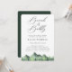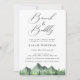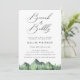 Rustik chic, vattenfärgsskog träd och bergslandskap, Brunch & Bubly inbjudningskort för möhippan. stil-mall för typografi av elegant med samordning av mörk grönt färg.