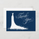 Elegant-möhippa eller bröllop "Tack"-anteckningskort för den snyggt som ska visas har ett ornerat calligraphy-skriptteckensnitt och en blommande bröllop-gryga. Rullans blomning, blommor och fjäril-detaljer visar den eteriska klänningen. Ett vanligt kortformat innehåller utrymme på baksidan för ett handskrivet meddelande. Design färg omfattar vitt och marint blått.