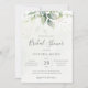 Vacker inbjudningskort för möhippan med vattenfärgad eukalyptus och guld löv med modern handskriven kalligrafi.