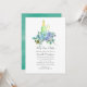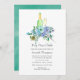 Mint and blue boho blommigt pop, fizz, clink inbjudningskort för möhippan med fredsfjädrar.