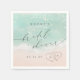Vacker turkos abstrakt vattenfärgsglande havsvåg och hjärtan i sandbotten, överst med snyggt och elegant serif-typsnitt, modernt och enkelt. Underbara blöjor för havets bröllopsknapp, tropiskt destinationsbröllop, kusthavets temade möhippa på sommaren.