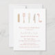 Ett trendig- och snyggt-kök temat inbjudningskort för möhippan som är designat med hjälp av en mängd köksredskap och tillbehör, till exempel kopp, knivar, konditioneringsmedel flaskor, gaffel och spenar, pannor och krukor. Utformningen finns i en vacker färg-palett med vintage. Anpassa enkelt med dina party-detaljer.
