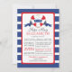 Modern röd, vit och blå inbjudningskort för möhippan. Våra Fraktaser Ahoy contemporary inbjudningskort för möhippan har ett rött och vitt rand hjärta Buoy med en blå banderoll med par initialer på. Bakgrunden är ett fet och ljust blått och vitt vågrät rand. Vänd inbjudan för en matchande rand tillbaka. Besök vår butik för att se den här roligten nautiska inbjudningskort för möhippan med en fet röd rand-bakgrund för en möhippa av sommarhavsstrand.
