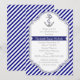 Marint blått, vitt rand och ankarplats vid sjön bröllop inbjudningskort för möhippan. En snyggt strimlade mönster-design med marint blått, vitt diagonalt rand, ett ankare med blått hjärta och rep och texten i ram med en banderoll. Modern men med en vintage ser ut på sätt och vis. Du kan ändra bakgrund och text som färg väljer från över 200 färger i diagrammet Zazzle färg. Den här klassdesignen är en fullständig mall för anpassade och ingår i en perfekt för bröllop under en sommar-bröllop.