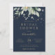 Vacker inbjudningskort för möhippan med vattenfärgad eukalyptus grey med guld-accenter på en marin blå bakgrund.