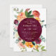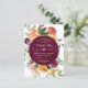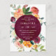 Modern blommigt vår inbjudningskort för möhippa med en burgundisk marsala-vattenfärgscirkel med en krans av peonier, ro och grön i skuggor av rosa, burgundi, rött och lush grönt.
