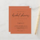 Terracotta-inbjudan för Möhippa av budgetskript. Ett budgetmässigt prist mindre än 4,5 x 5,6 tum alternativ. Finns i ett SEMI-GLOSS 110 lb-kort LAGRAR som är ungefär lika tjockt som vykort. Det finns EN per lakan. Möhippan finns i ett set handskriftsskript stil. Anpassa enkelt resten av texten till dina egna detaljer. Du kan också ändra färg och bakgrund genom att anpassa ytterligare alternativ om du vill.
