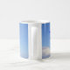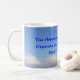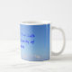 "Ditt livs lycka beror på kvaliteten på dina tankar" som är tryckt på ett foto av himmel skapat i ett kaffe mugg.