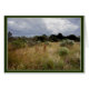 Stormmolnen samlas över fält med en mängd olika gräs och shruber.