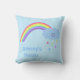 En fyrkantig kudde för ett daghem eller barnrum, dekorerad med en regnbåge, ett sött moln från baby och regndroppar från färgad. Du kan anpassa den med ditt namn och ord. Bakgrunden är blek blå, texten är blå för ett pojke.