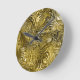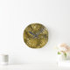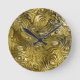 Väggklocka med coolan "flytande metall-utseende" abstrakt utformning och snurrande, bubblande former i skuggor av gult guld. Kan användas som bakgrund för din egen text, bilder och dina idéer. Observera att det här är en digitalbild som trycks på mot en akryl bakgrund, som inte skiner eller innehåller äkta metall.