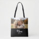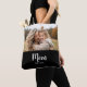 Black White Mom Established Script Text Photo Design Black Tote Bag. Celebrate moms and mom’s-to-be on Mother’s day with this simple, elegant tote bag design showcasing a favorite photo of Mom, the word “Mom” in playful script text for a cheerful vibe and space for you to personalize with an “Est. year” underneath. You can also change "mom" for mommy, mum, mam, mama or any name you prefer to use.