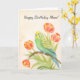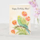 Parakeet tulip watercolor birthday card for mom featuring a delicate hand painted budgie perched among soft blooming tulips on a warm, peaceful background. Created with gentle color and botanical detail, this elegant design offers a heartfelt and calming way to celebrate your mom on her special day.