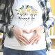 T-shirt for a mother-to-be with a bee theme. Designed with an image of a bunble bee and a collage of whimsical pastel flowers, Test caption "Mommy to Bee" can be dited. Cute spring or summer design, coordinates with items in a whole baby shower collection.