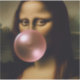 En lustig återgivning av Mona Lisa som blåser en rosa bubbelgum