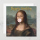 Mona Lisa som blåser rosa bubbelgum. "Grattis på födelsedagen" text i guld.