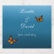 Elegantens monarch-smörgåsar i orange mot en blå ombre-bakgrund, skapar en romantisk och naturinspirerad design. Perfekt för utomhusbruk, trädgård eller fjärilskrävande bröllop.