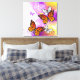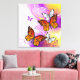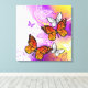 Orange, detailed monarch butterflies on light, purple, picturesque, painted background.