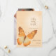 Enkel. Modern. Elegant. Vacker orange monarkbröllop Spara datum-inbjudan med foto på baksidan av inbjudan. Denna bröllopsinbjudan har en akvarellillustration av en lugn fjäril som flyger mot en sol som sprider solstrålar. Det finns vackra nyanser av dämpad orange, brun och krämfärg. Redigera baksidan av detta kort med en bild av det förlovade paret.