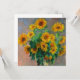 Kort med Claude Monets oljemålning Bouquet av solblommor (1881). Fina solblommor i blå vas vid ett rött bord. En underbar gåva till fläkt av imponsionism och Fransk konst.