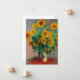 Kort med Claude Monets oljemålning Bouquet av solblommor (1881). Fina solblommor i blå vas vid ett rött bord. En underbar gåva till fläkt av imponsionism och Fransk konst.