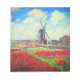 Anteckningsblock med Claude Monets blomma och kvarn. Vacker och färglös fält av rött, rosa och gult tulpaner bredvid ett kvarn och hus i Nederländerna. En underbar Monet-gåva till fläkt av imponerande och Fransk konst.
