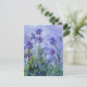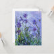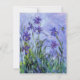 Monet Lilac Irises inbjudningar. Oljemålning på duk från 1917. Monet målade irisar under hela sin karriär, detta är en av hans sista iris-målningar och verkligen en av hans mest gripande. Verket är tungt impressionistiskt och de mörklila irisarna tycks nästan sväva i vatten ovanför sin mörkgröna lövverk, himlen ovan är mjuk blå och lila. En vacker present för fans av Claude Monet, Impressionism, iris-målningar och fransk konst.