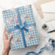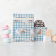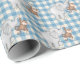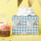 Cute-grått-elefant med apa hängande från sin koffert med blått och krämgingham mönster.