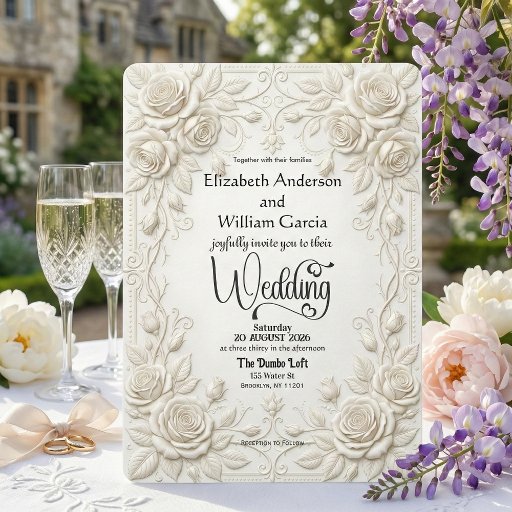 This design features a hyper-realistic digital rendering of baroque scrollwork and blooming white roses, simulating the look of hand-carved architectural plaster. The palette is a sophisticated monochrome study in ivory and cream, with soft grey shadows adding simulated depth to the serrated leaves and vines bordering the layout. Text is arranged in a formal hierarchy, utilizing an elegant black calligraphy script for names paired with a traditional serif font for event details, ensuring high contrast and legibility against the light stone-like background.