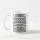 Enjoy your coffee with this striking black and white mug featuring a seamless textile sampler pattern. The design mimics stacked rows of bohemian knit and woven trims, including chevrons, waves, chains, and geometric stitching for a modern folk-art feel.