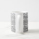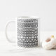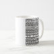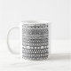 Enjoy your coffee with this striking black and white mug featuring a seamless textile sampler pattern. The design mimics stacked rows of bohemian knit and woven trims, including chevrons, waves, chains, and geometric stitching for a modern folk-art feel.