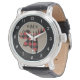 Här är en roligt och trendig-klocka som också är attraktiv! I mitten finns ett rött och svart buffelpläderat silhuettmoshuvud. Ovanför mosbilden är ditt tre brev monogram svart. Bilden placeras på en ljusbrun bakgrund, som omges av en svart cirkel med vita tal, och skapar den på ett lättläst sätt.