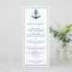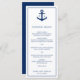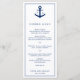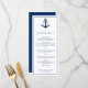Nautisk bröllop-meny med en marin blå ankarpunkt med ditt monogram på vardera sidan, över en vit bakgrund. En enkel men elegant-design som är perfekt för en strand som temat firande på sommaren.